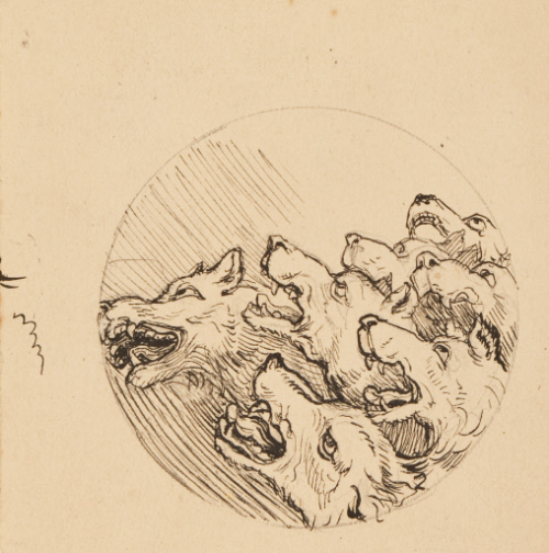 Label TextThis drawing is one of numerous preparatory sketches made by the Pre-Raphaelite artist, Frederic Shields. In 1887, Shields was commissioned to create a non-denominational chapel, based on early Italian models, in the Bayswater section of London. His scheme for the interior decoration took over twenty years to complete. The subject depicted relates to Psalm 22, verse 16, "the dogs have encompassed me..." and relates to Christ's Passion. It was part of the decorative scheme of the chapel, and was intended to fill one of the many spandrels of the interior.Frederic James Shields