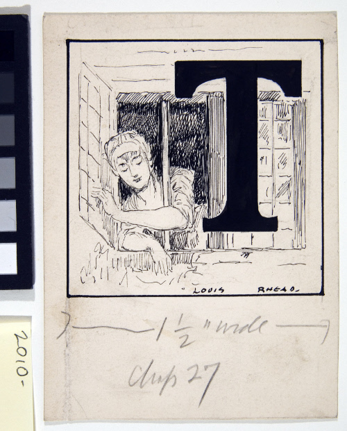 Illustrated initial T for Kidnapped / Headpiece for chapter XXVII / woman at window
