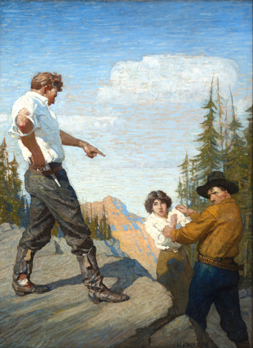 Label TextN. C. Wyeth illustrated a scene from this novel about the waning days of the frontier West. Here, a woman is rescued by her cousin as she resists the advances of a man who insists that she marry him. The threatening figure of Henry de Spain with his warning gesture set against the sky and parallel to towering pine trees makes the other figures seem small and earthbound by comparison.