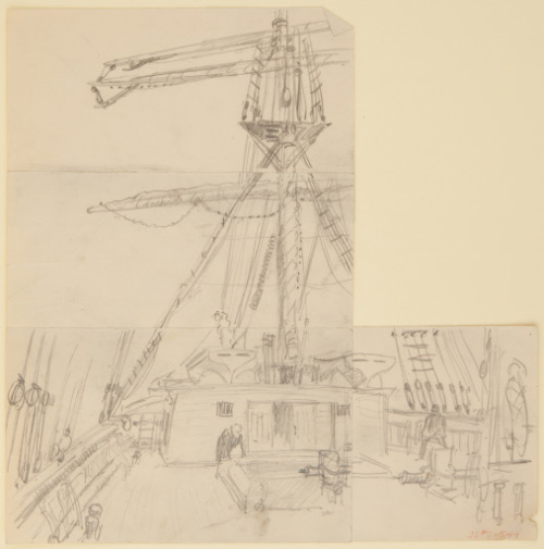 Label TextBetween 1908 and 1913, Sloan illustrated several comic stories about pirates by the author Ralph Bergengren. Probably in preparation for this, Sloan produced many drawings of ships' decks, riggings, and interiors that cannot be linked to specific published illustrations.