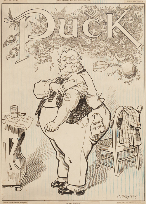 Label TextLouis Glackens cartoon shows a portly man labeled "Trust Official" inoculating himself against "Personal Immunity," with a concoction prepared by Congress, while winking at the viewer.