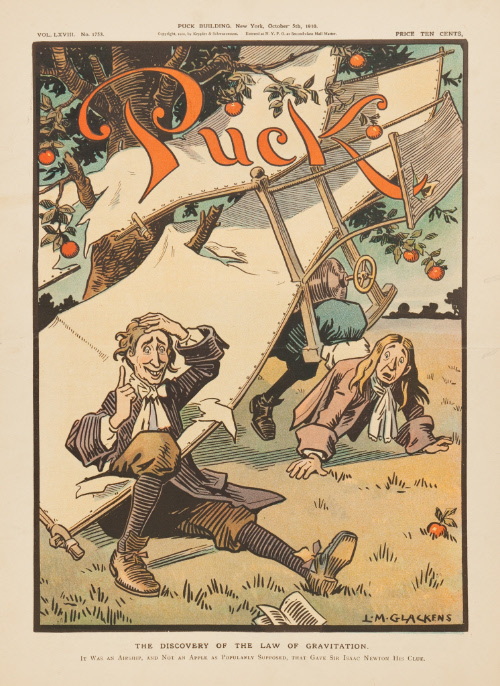 Label TextLouis Glackens depicts a Wright Brothers airplane crashed into a tree, as Isaac Newton - who formulated the law of gravitation - and another 17th century character century draw their own conclusions.
