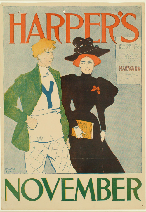 Label TextAs art director for Harper and Brothers, Edward Penfield designed a series of posters to advertise Harper’s New Monthly Magazine, creating a unified marketing campaign in a signature style. The posters feature large areas of flat color and depict one or more figures in some sporting or leisure activity, often reading or carrying an issue of the magazine. The subjects usually reflect the upper class status of the magazine's readers.Penfield's posters were popular during the so-called Poster Craze of the 1890s. One critic remarked on the high quality of such works in 1899: "Book and magazine covers, lettering, theatrical bills, advertisements, in fact anything with which the poster could have the slightest affiliation has profited materially. In fact, we are...at this time accustomed to good, strong decorative work in advertising of all sorts..."
